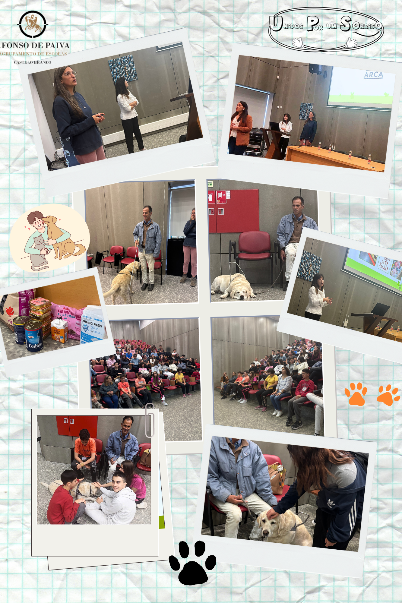 No âmbito do pilar “Saúde, Bem-Estar e Ambiente”, explorado no Projeto UPS (Unidos Por um Sorriso) e sequência do Dia Mundial do Animal, realizou-se, no dia 21 de outubro, uma ação de sensibilização no auditório da Escola Básica Afonso de Paiva. A iniciativa contou com a participação dos alunos do projeto e de duas turmas do 9.º ano, que tiveram oportunidade de refletir sobre o bem-estar animal.