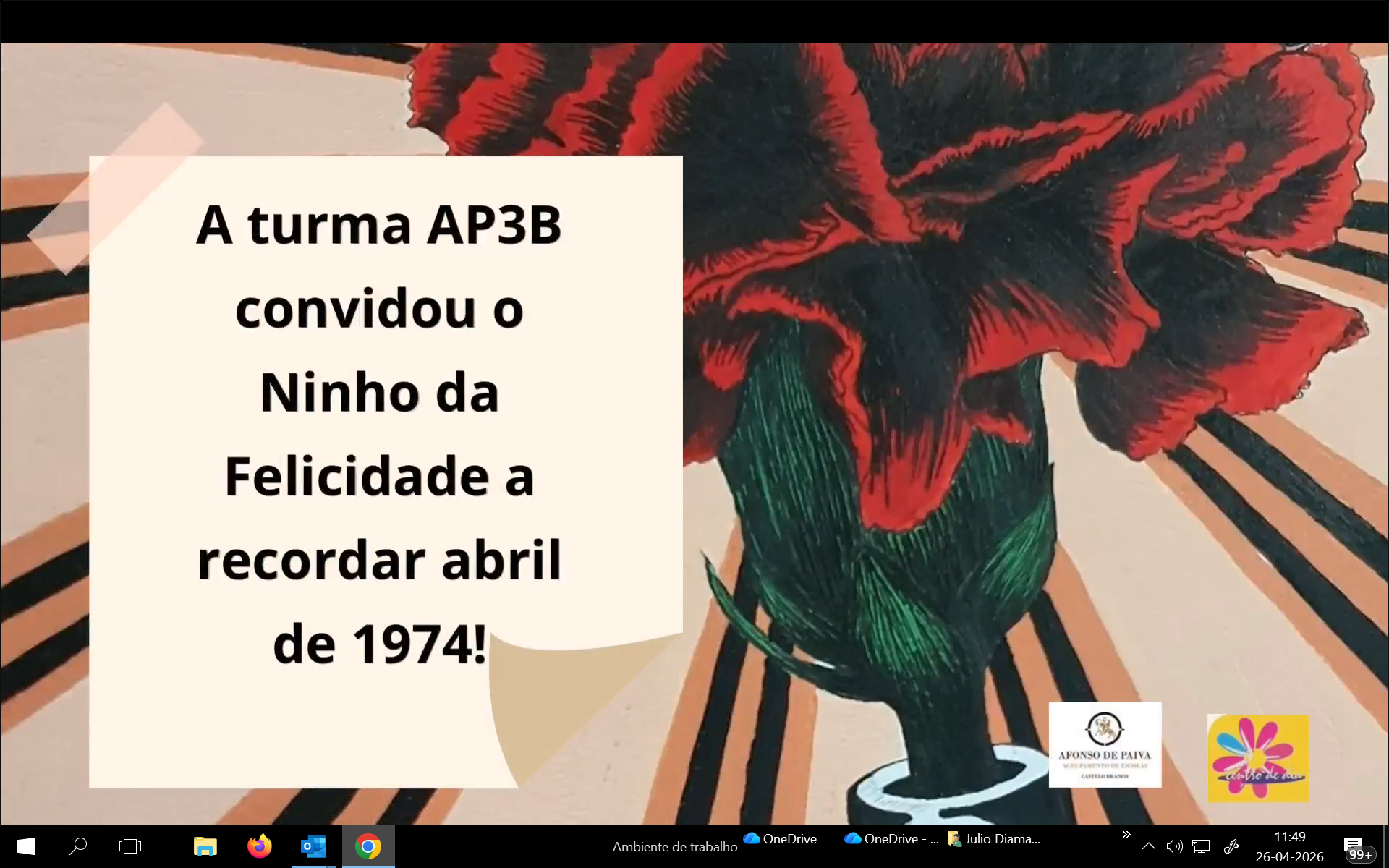 No âmbito do projeto Partilh’Ativa, a turma AP3B do Agrupamento de Escolas Afonso de Paiva desenvolveu uma atividade dedicada ao 25 de abril, promovendo o encontro entre gerações e a partilha de memórias.