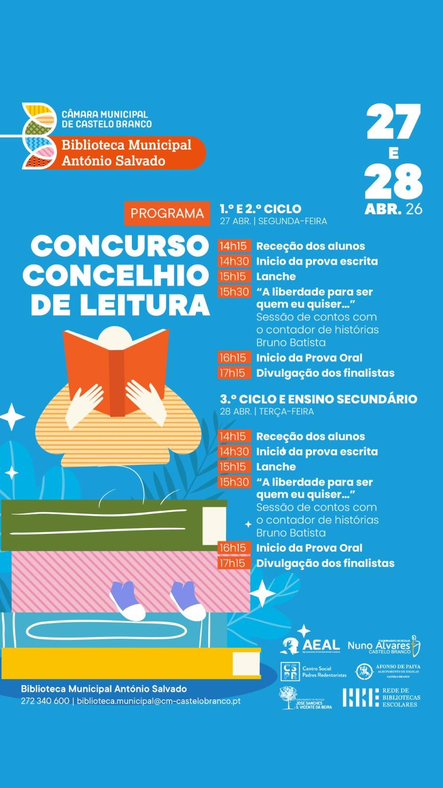 Nos dias 27 e 28 de abril de 2026, a Biblioteca Municipal António Salvado recebe alunos de várias escolas do concelho de Castelo Branco, para mais uma edição do Concurso Concelhio de Leitura — um momento enriquecedor em que os alunos mostram o seu talento e manifestam o gosto pela leitura. O Concurso Concelhio de Leitura pretende valorizar o património cultural, desenvolver o sentido crítico e promover a leitura expressiva em voz alta, transformando a leitura num ato de prazer e convívio.
